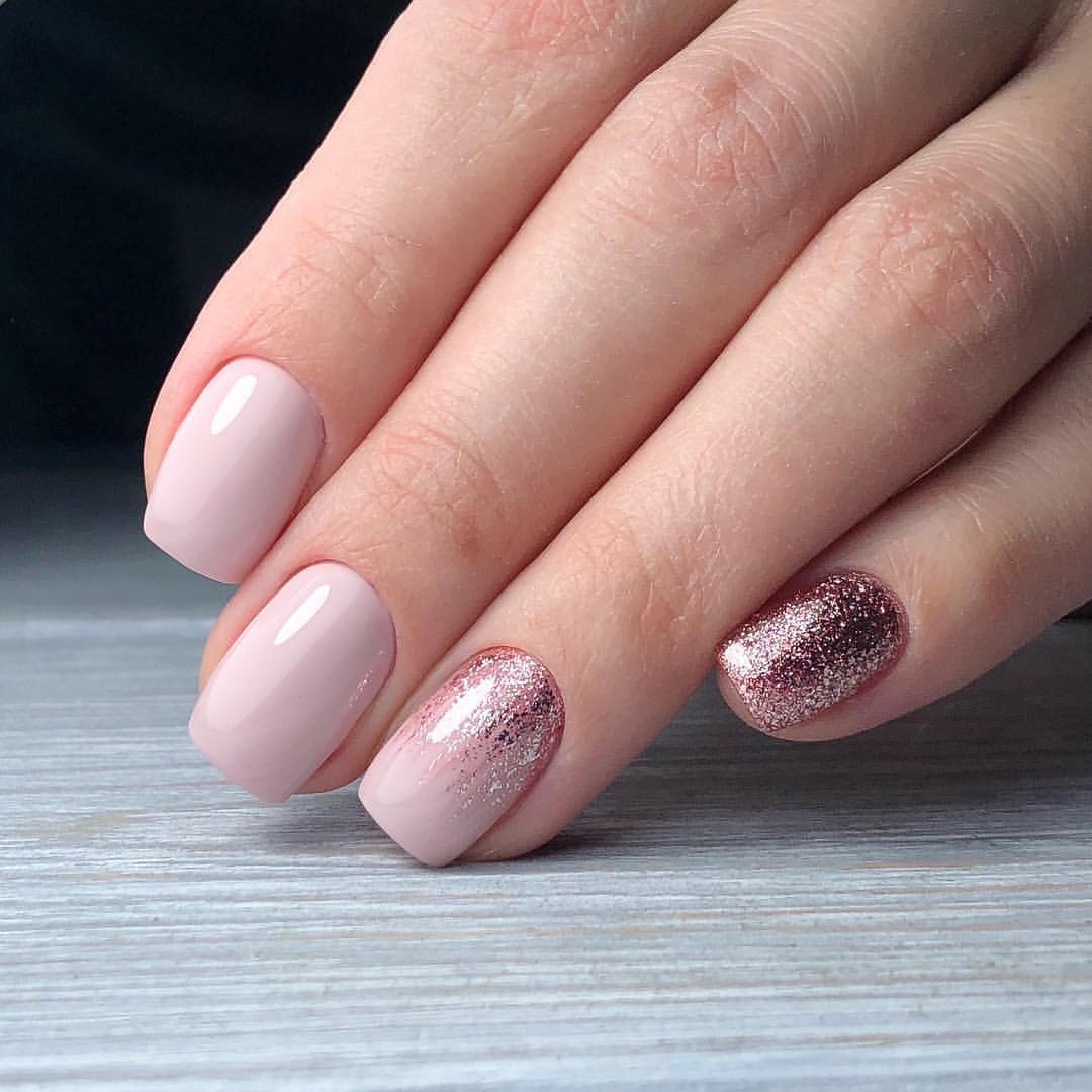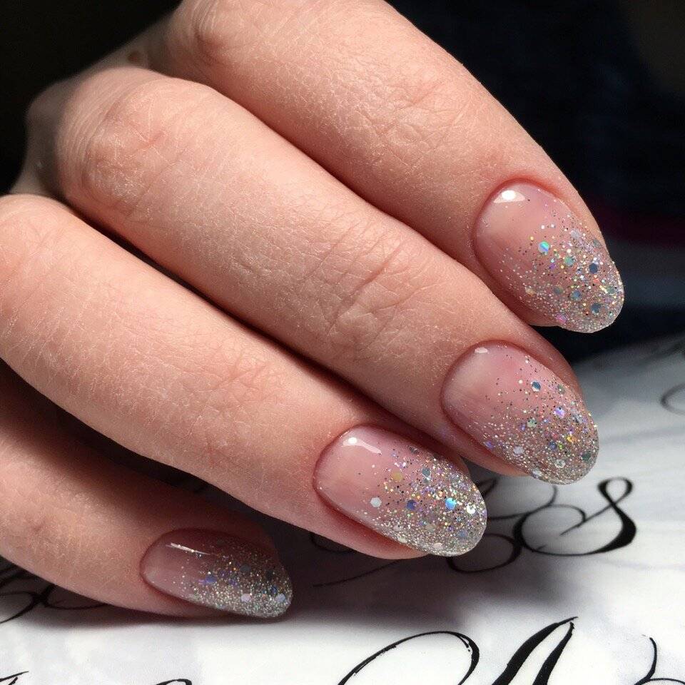 Эти тонкие прозрачные ногти напоминают нам о бокале с шампанским. Они идеально подходят для торжества. Нарисуйте два слоя розового оттенка, а дальше добавьте омбре и блестки. Для такой точности используйте специальную губку, чтобы нанести ее на ногти. Не забудьте о глянцевом верхнем слое.