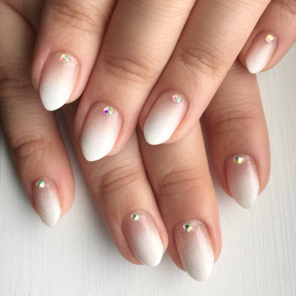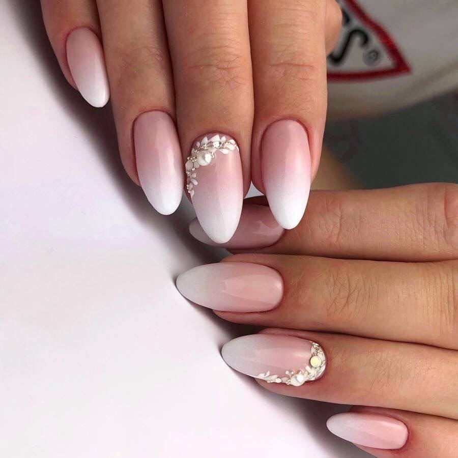 Хоть градиентный переход был актуален лет 5 назад и недавно считался антитрендом, в этом году он с триумфом вернулся в свадебную сферу. Невероятно нежный эффект достигается путем растяжки одного цвета в другой, причем желательно использовать пастельные цвета. Очень красиво смотрится бело-розовое и бело-бежевое омбре. Такой модный свадебный маникюр будет хорошо смотреться на миндалевидных или овальных ногтях средней длины. На коротких ногтях мастеру будет неудобно работать, хотя дизайн способен визуально удлинить их.