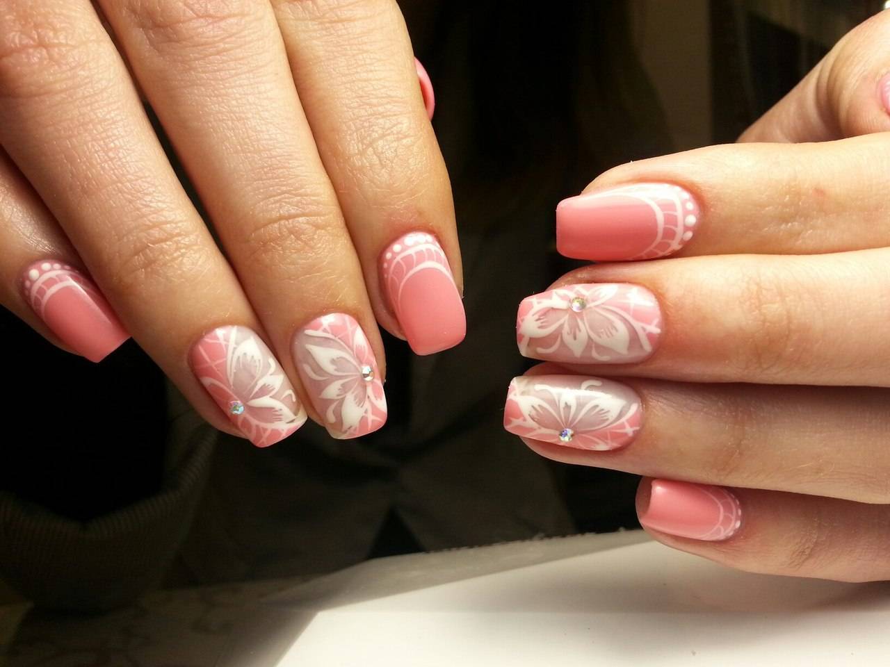 Не путайте этот дизайн ногтей со свадебным маникюром для невесты, который был модным лет так 10 назад. В отличие от устаревших кружев и вензелей, ажур рисуется очень тонко, может дополняться цветами и стразами. Подложка представляет собой не сплошной плотный цвет: она может быть как прозрачной, так розовой или бежевой, но полупрозрачной.