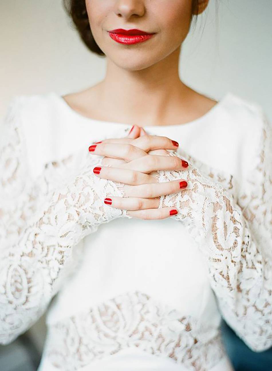 Маникюр в красных тонах станет изюминкой свадебного образа. Этот цвет подойдет страстным, чувственным и энергичным невестам, которые не боятся демонстрировать свои достоинства. Тем более в Интернете можно найти множество интересных идей красного маникюра, который будет уместен и на свадьбе. Однако учтите, что лучше всего смотрится такой маникюр на коротких ногтях. Отличным дополнением к такому яркому нейл-арту станет красная помада в макияже.