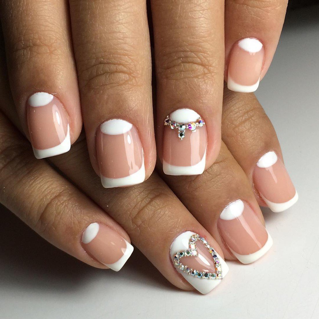Также камень можно вписать в орнамент на ногте. Очень популярной стала идея украшать стразами безымянный палец и таким образом выделять его. Подобный свадебный маникюр френч со стразами (фото ниже) смотрится изысканно и величественно.