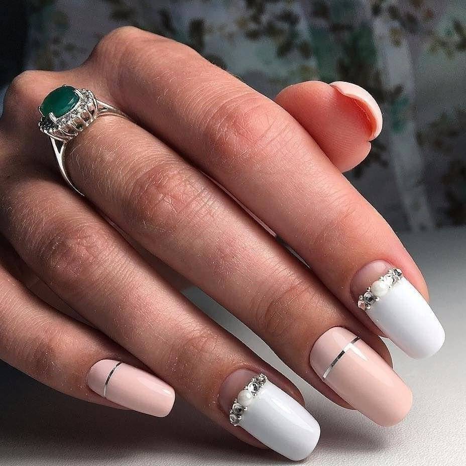 Эти свадебные ногти находятся вне времени. Из многих видов свадебного маникюра – этот базовый стиль никогда не подведет. Используйте розовый и кремовый оттенки. Также вы можете использовать традиционную полироль с глянцевым верхним слоем или гель лак для идеального глянцевого покрытия.