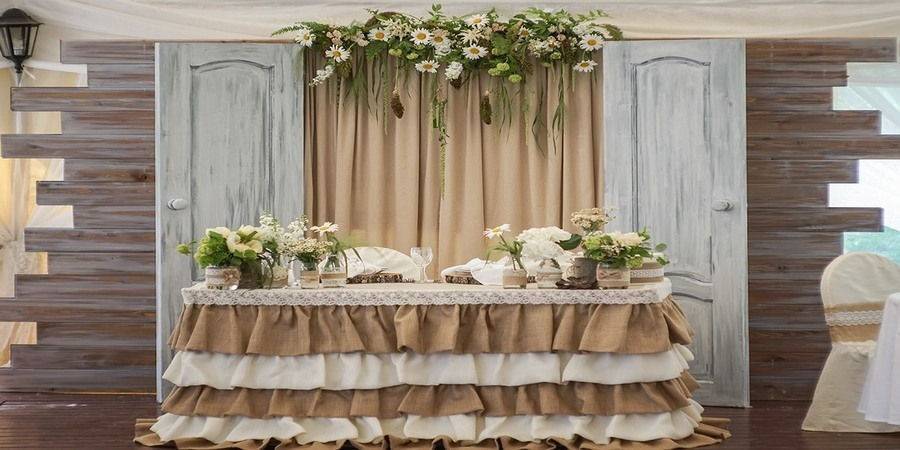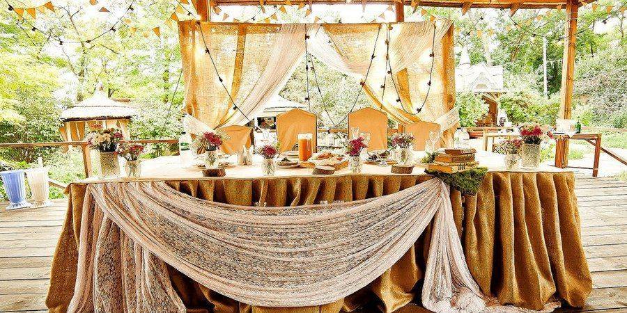 Интересно, если столы будут простыми деревянными, а посадить гостей можно на лавки или даже пеньки. Скатерть выбирайте из мешковины или натуральной ткани, декорированной какой-нибудь вышивкой либо орнаментом.