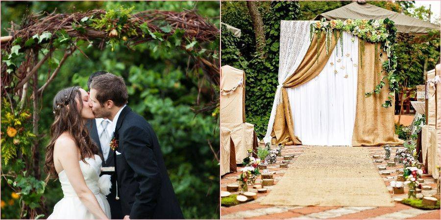 Замечательно будет заказать свадебную арку для регистрации на свежем воздухе. Она выполняется из натуральной ткани, веток, цветов или лент.