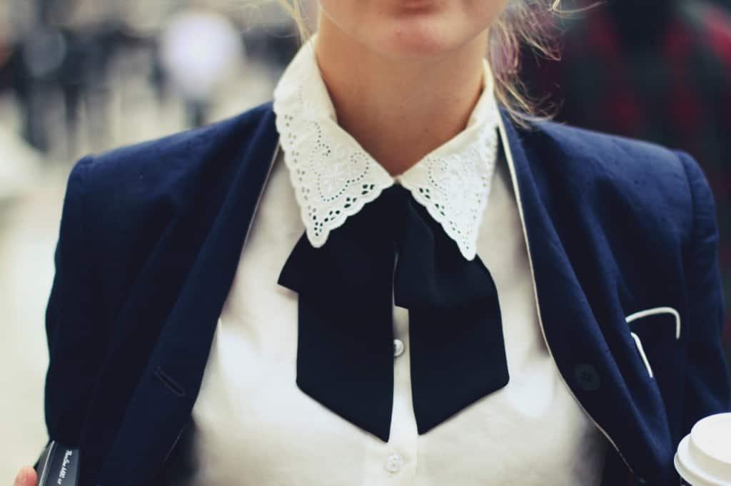 Чаще всего бант носят с блузкой либо рубашкой с отложным воротником.