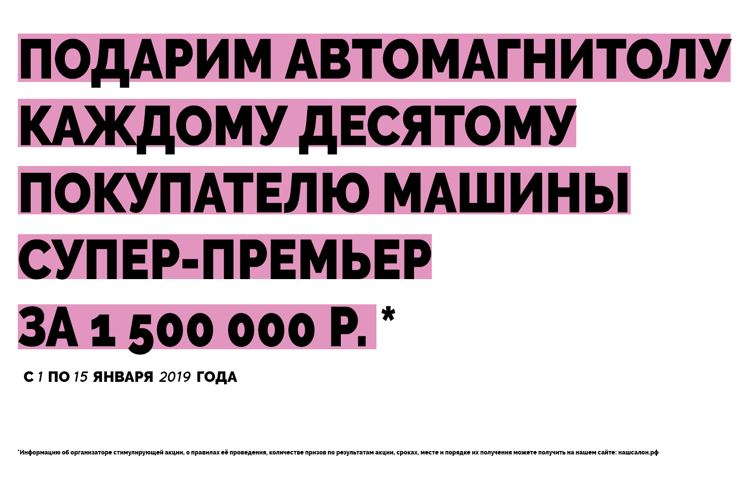 В яркой части рекламы есть условие: купи машину — получи автомагнитолу. Условие звучит так, будто каждому покупателю салона дарят магнитолу. Но мелким шрифтом: «магнитолу получает каждый десятый покупатель машины марки „Супер-премьер“ в максимальной комплектации за 1 500 000 рублей». Так нельзя.