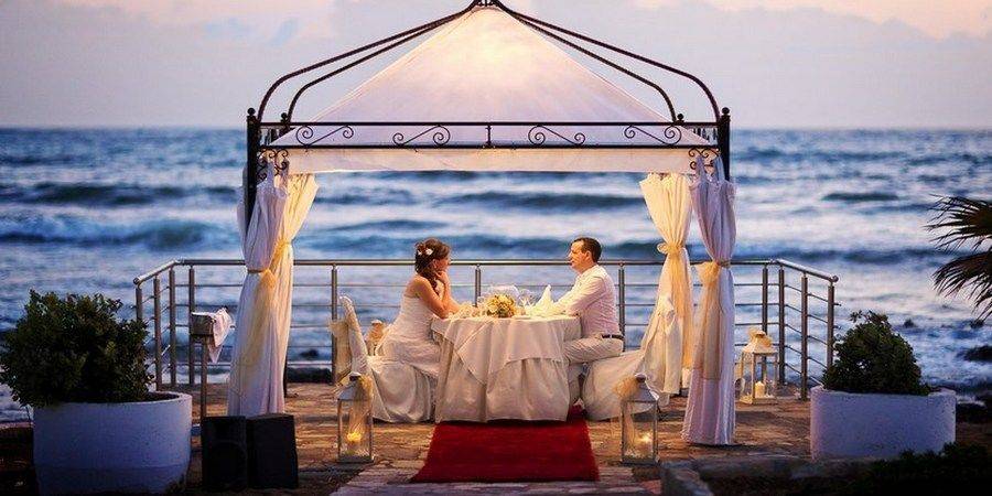 - В основном влюбленные стараются выбирать стилистику мероприятия в национальных образах. Новобрачные в местных костюмах, невеста в наряде и с прической в греческом стиле — все это изысканно смотрится на фотографиях. Большая часть мероприятий проводится на белоснежном побережье. На нем ставится арка из тропических цветов, а гости размещаются посреди пляжа.