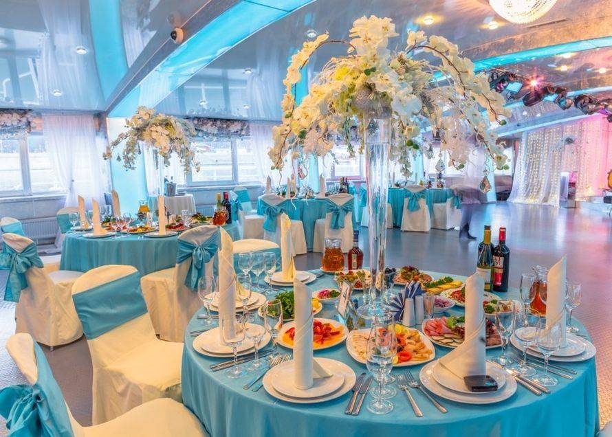 Теплоход или катер с рестораном. Стиль торжества предполагает наличие воды, поэтому молодоженам с гостями идеально будет отправиться на борт настоящего корабля, чтобы отметить соединение двух сердец. Хорошо, если получится поехать в морское путешествие, но даже прогулка на теплоходе по реке оставит незабываемые впечатления у всех гостей праздника. Существует варианты съема водного транспорта на любой вкус, количество гостей и кошелек.