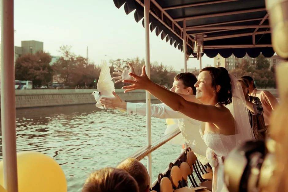 - Второй вариант, который не менее актуален, — пригласить гостей сначала в загс, а затем – на прогулку на теплоходе. Такой праздничный банкет будет гораздо интереснее и оригинальнее, нежели банальная свадьба в ресторане и прогулки на лимузинах.