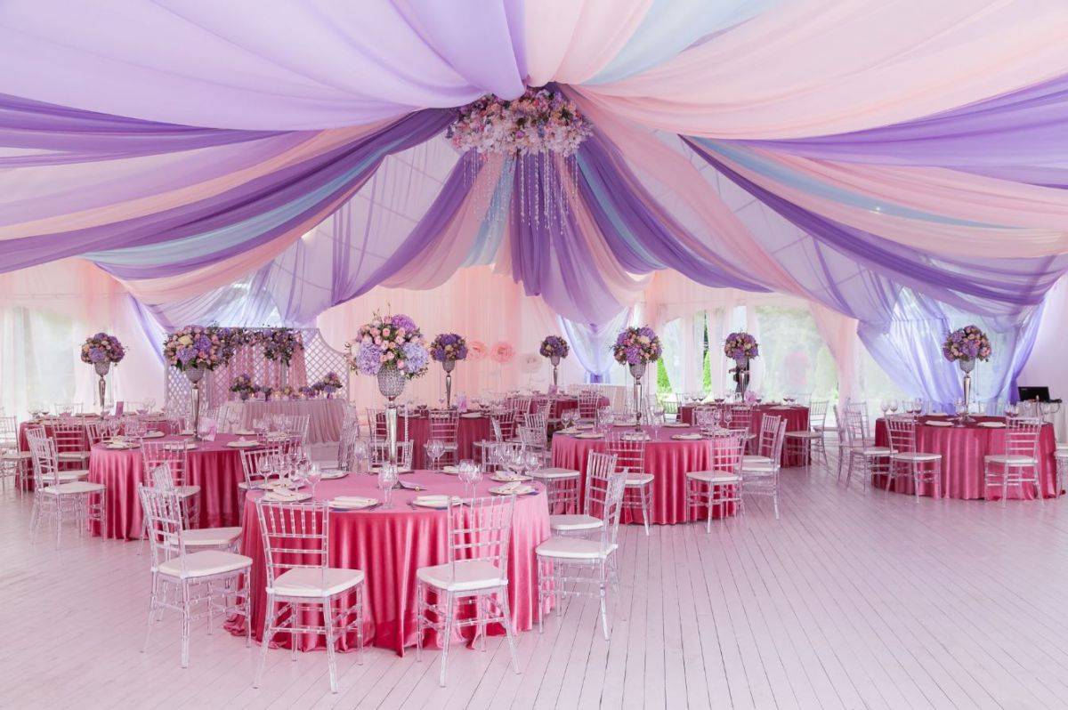 Для оформления используют не только ткани и различные цветочные композиции, но и свадебные декорации. Правильная организация и расстановка акцентов может полностью изменить интерьер и его геометрию.