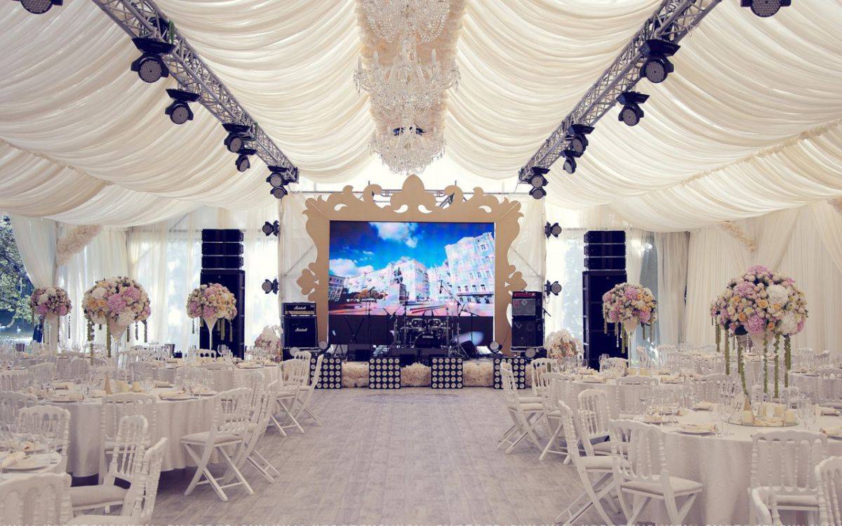 Если торжество планируете на зимний период, то бронируйте полностью закрытый павильон, заранее предусмотрите газовые обогреватели или тепловые пушки. Именно зимой полная драпировка будет смотреться как нельзя кстати, одновременно подчеркивая торжественность мероприятия и создавая уютную и комфортную обстановку.