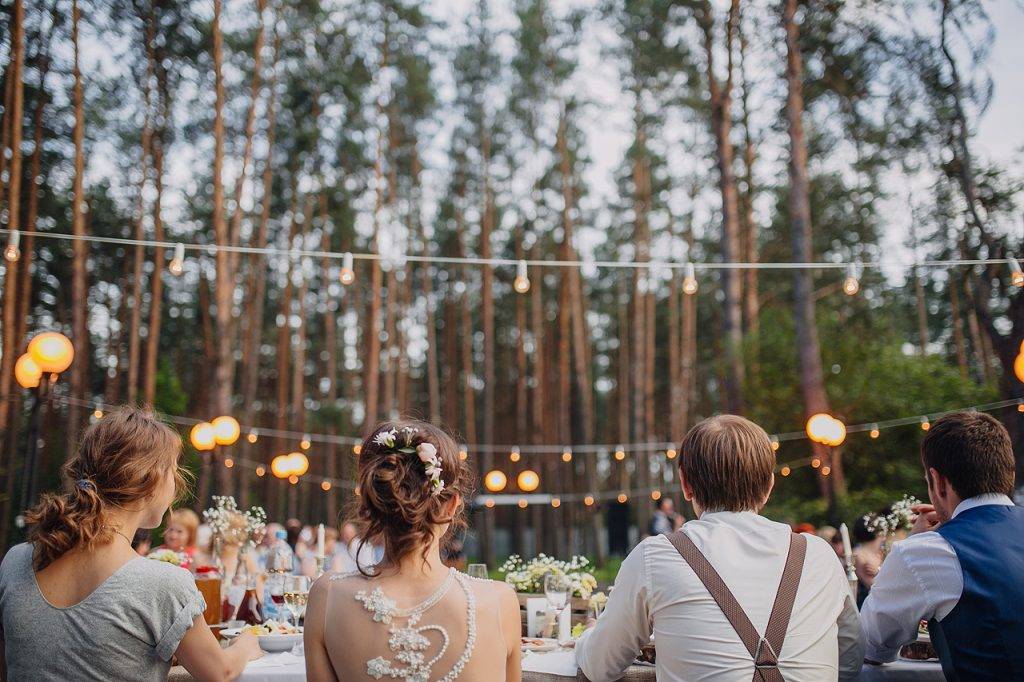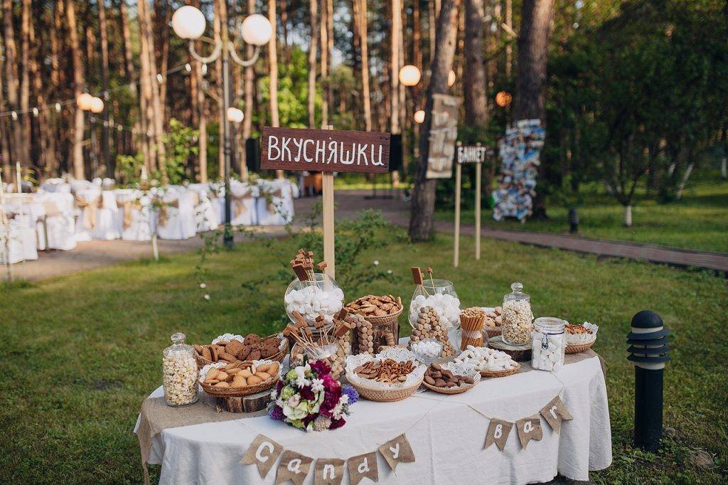 Лесная полянка сама по себе живописна. Чтобы придать месту проведения торжества нарядный вид, можно дополнительно украсить территорию. Проявив фантазию, декор легко создать своими руками. Это могут быть объемные буквы-подушки с именами молодоженов, бумажные гирлянды и китайские фонарики. Из веток, поленьев, шишек и орехов можно изготовить интересные инсталляции и веночки, а деревья в лесу украсить разноцветными лентами. В качестве места регистрации подойдет красивое раскидистое дерево, украшенное полотнами органзы и шифона. Особую романтику создадут зажженные свечи в стеклянных колбочках, расставленные вдоль дорожки, по которой невеста идет к алтарю.
