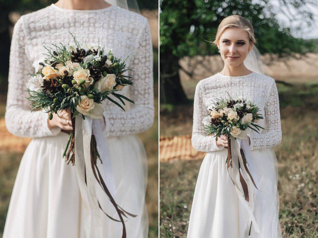 Букет невесты выполняется из садовых и полевых цветов. Зачастую в нём вообще можно обойтись без цветов. Их отлично заменят суккуленты, сухоцветы, листья папоротников, хлопок, колоски и трава. Такой букет будет отлично соответствовать свадебному стилю.
