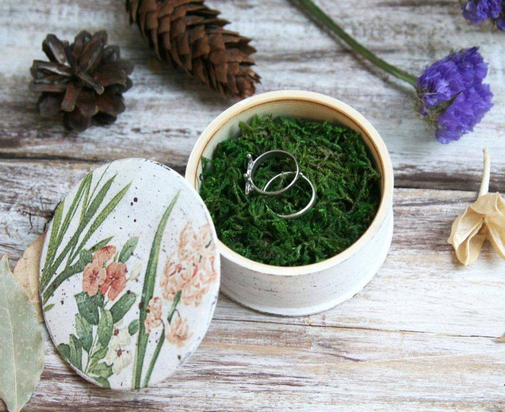 - Держатель для колец. Его можно оформить в виде птичьего гнезда, который лучше всего сплести из лозы. Внутрь следует положить мох и отрезок мешковины, на которой и будут лежать кольца.