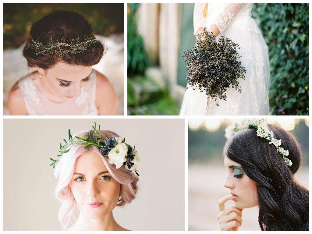 Небрежные натуральные локоны, нетугой пучок – любая разновидность «управляемого хаоса» будет хорошим вариантом для причёски невесты. Освежит образ венок из живых цветов. Вместо цветов его можно сплести их веточек, трав и листьев.
