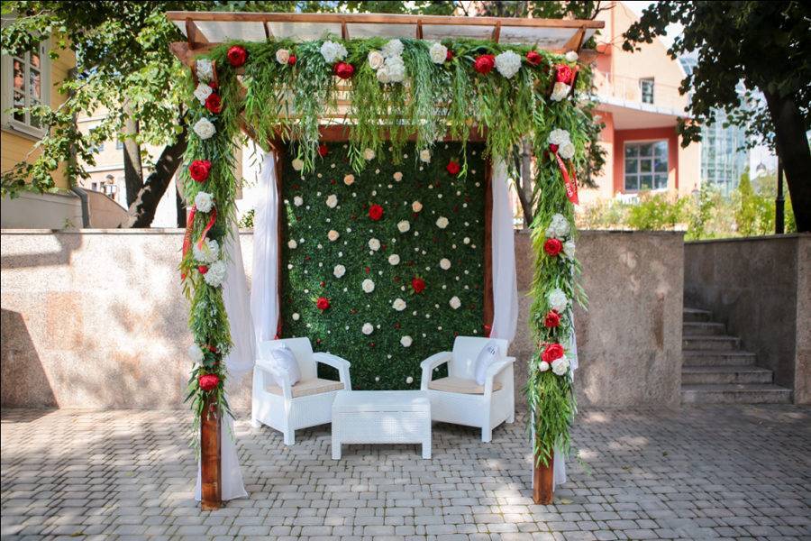 - Мобильный навес или беседка, на случай непогоды, который спасет молодоженов от дождя.