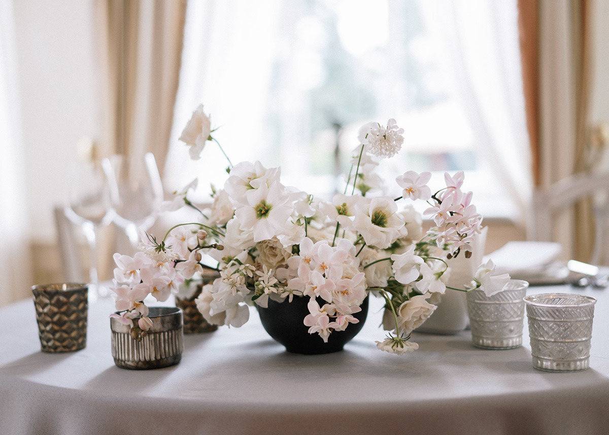 – состав, стиль и цвет цветочных композиций в ресторане должны совпадать со стилем букета невесты