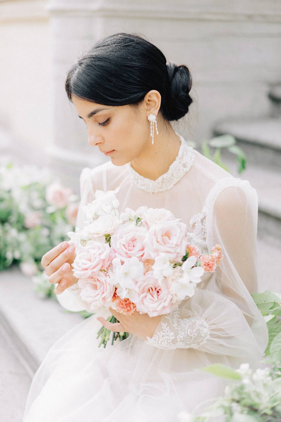 - Комбинация пионов с раскрытыми и закрытыми бутонами придаст образу новобрачной искренние нотки свежести, нежности и чистоты.