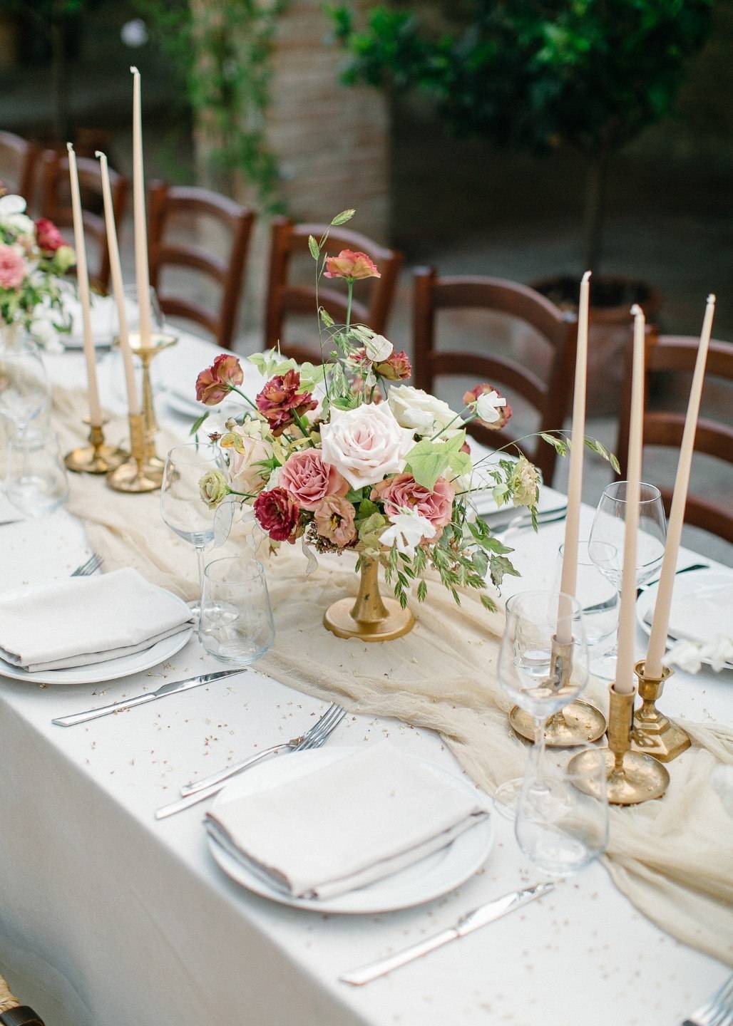 Однозначно на стол молодожен и столы гостей я бы выбирала 100% живую флористику, а при достаточно объемных композициях — микс качественных искусственных цветов, живой флористики и зелени.