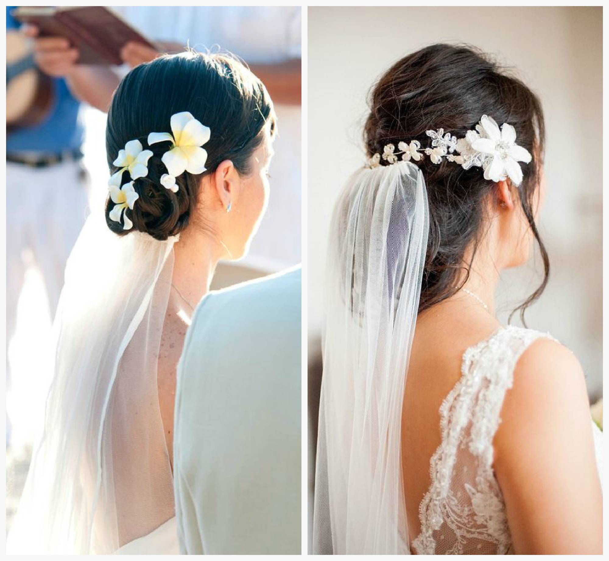 Цветы – это менее капризный аксессуар, чем фата или диадема, поэтому его намного проще сочетать с платьем и стилем церемонии. Тем не менее следует сохранять баланс и не использовать слишком большое количество крупных цветов в прическе. Достаточно ограничиться одним или двумя элементами