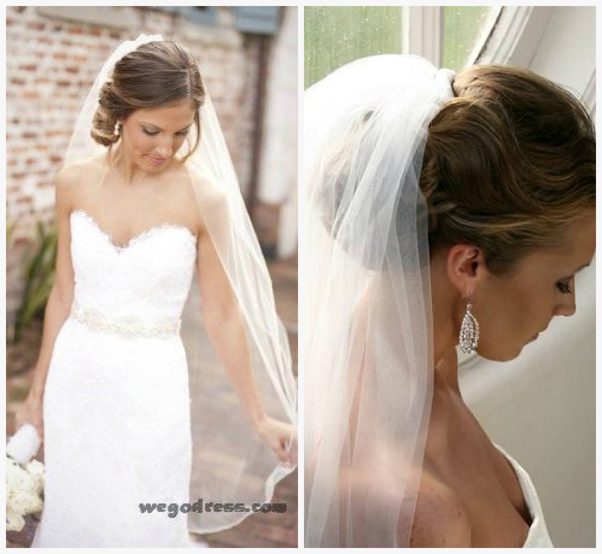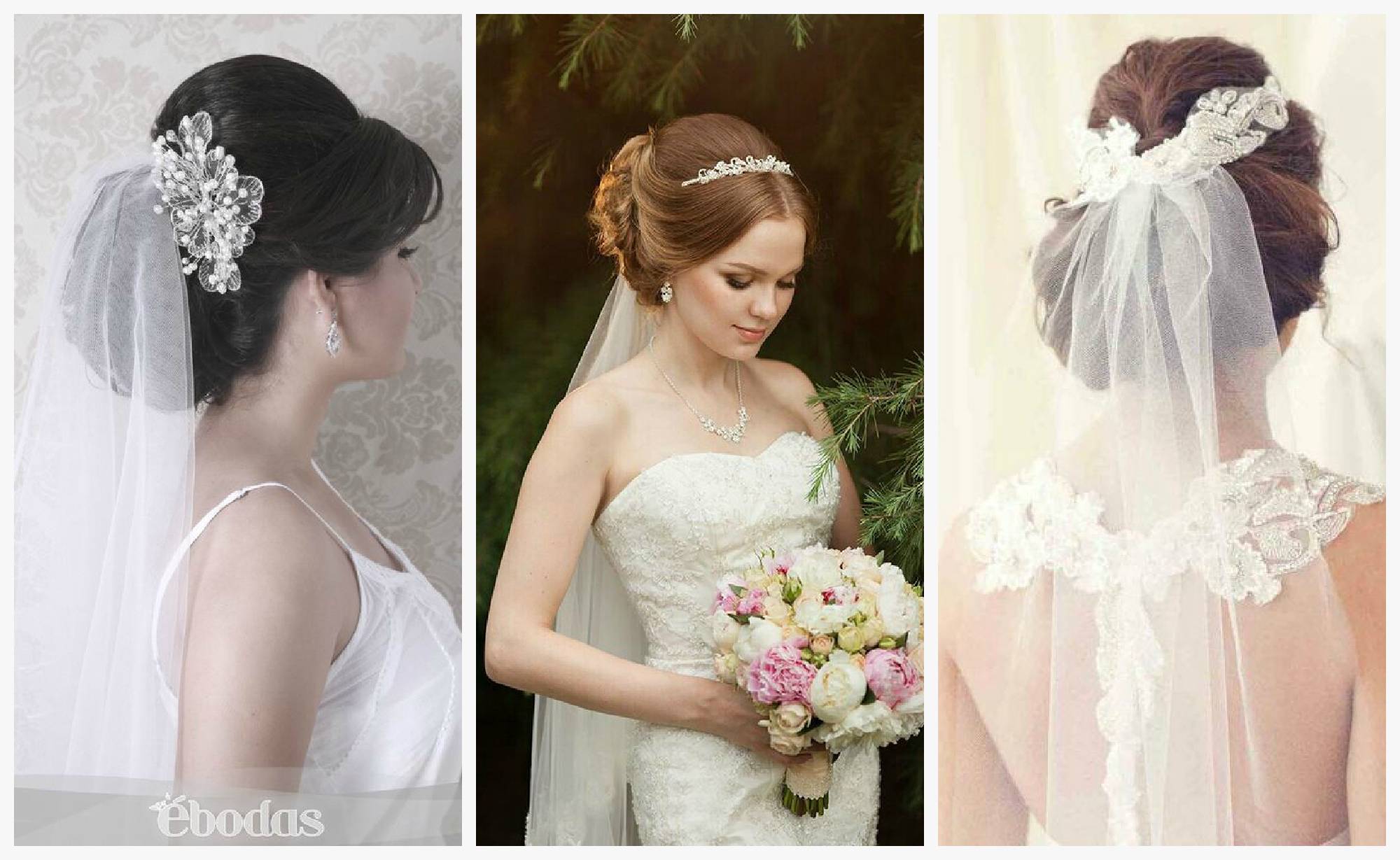 Пучок на затылке с гладкой или пышной укладкой впереди прекрасно подходит под фату.