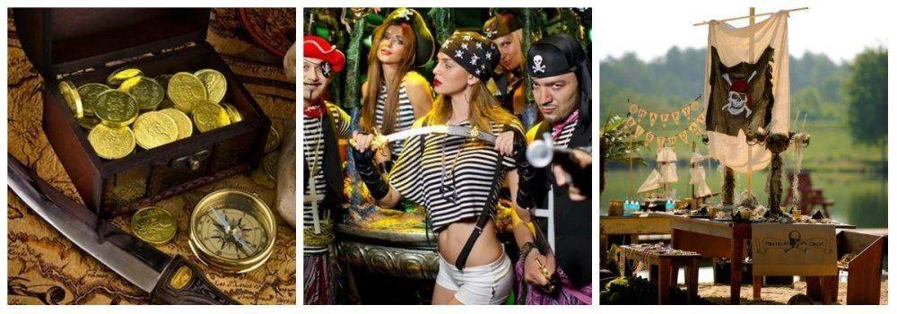 В основе этой вечеринки обязательно должен лежать какой-нибудь необычный квест. Карта острова Сокровищ, таинственные знаки, зарытый клад… Ваши гости непременно должны окунутся в атмосферу приключений. При желании можно даже распределить роли между пиратами. Для украшения найдите пиратский флаг, гирлянды из флажков, старые рыбацкие сети, плетеная мебель, сундуки, шоколадные монеты, разноцветные стеклянные камни из зоомагазина, бутафорское оружие, якоря и модели кораблей.