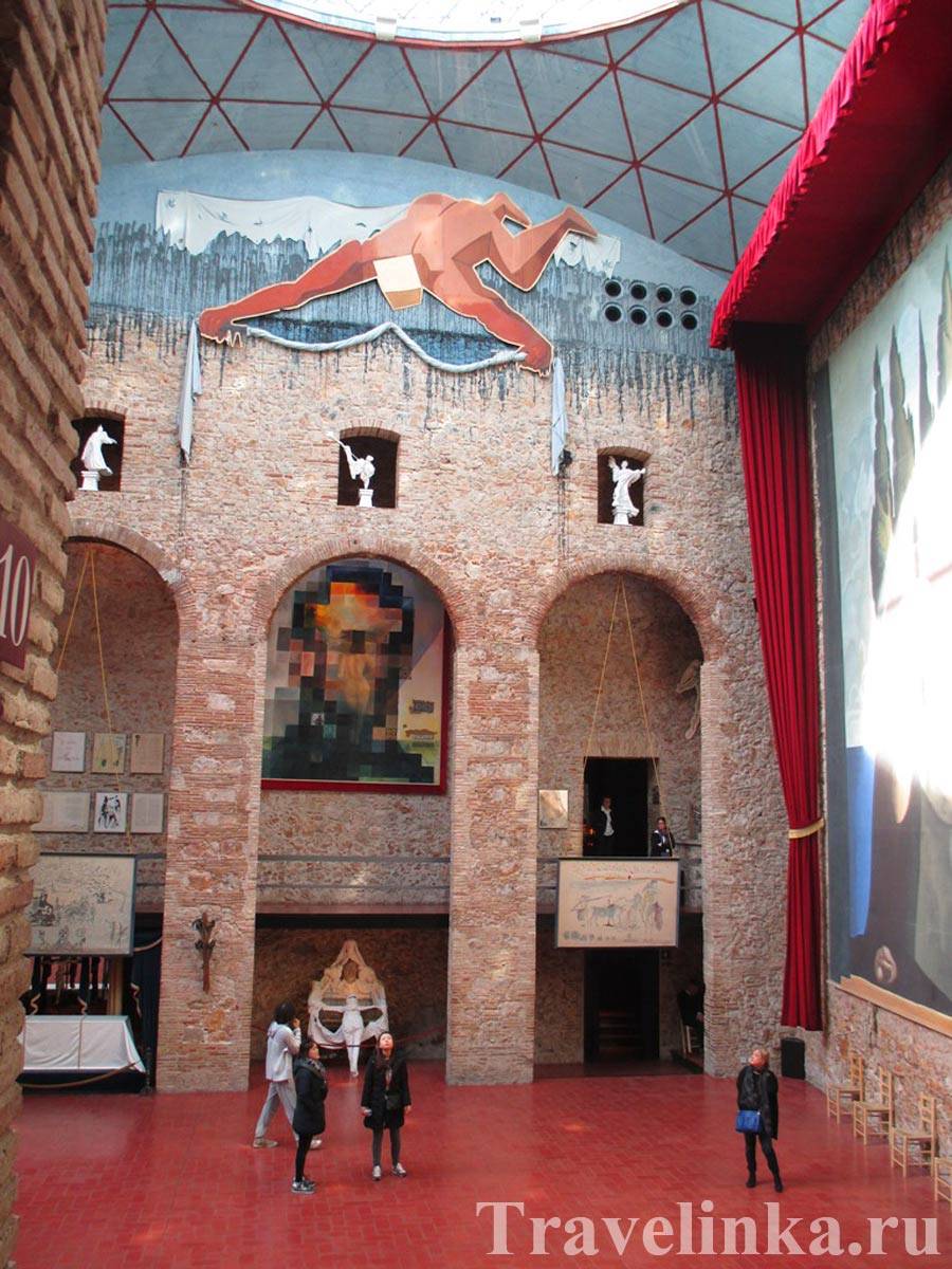 Под прозрачным куполом находится сцена театра-музея, а на ней расположено несколько известных работ художника. Например, тут размещена знаменитая картина «Смотрящая на море обнаженная Гала». Уникальность этой картины в том, что если отойти от нее на расстояние более 20 метров, изображение волшебным образом «преображается», превращаясь в портрет Линкольна. Для создания этой уникальной картины «трансформера» художник впервые применил специальную цифровую технику.