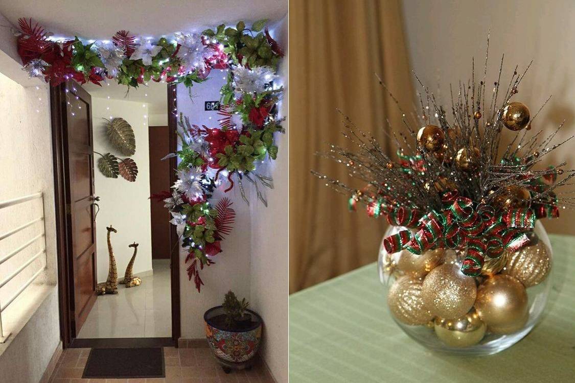Подчеркнуть праздничность атмосферы помогут икебаны с использованием красиво оформленных веток хвои. Пришедшее из Японии искусство дает возможность выполнить красивые украшения с использованием простых вещей: красивых бутылок, необычных по форме плошек из глины или подносов. Часто такой декор предполагает использование серебряной или бронзовой краски, когда визуальный акцент привлекается к блестящей рождественской звезде или колокольчику. Гармонично дополняют интерьер новогодние композиции с использованием красных или белых цветов, мандаринов, яблок, лент, бус, свечей и небольших елочных шаров. Оригинально будет смотреться на подоконнике небольшая елка или снеговик.