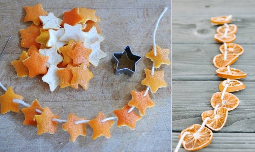 За несколько дней до украшения комнаты начните собирать шкурку от мандаринов, апельсинов и лимонов. Затем, когда подходит время, из них можно вырезать с помощью канцелярского ножа любые фигурки. Оригинально смотрятся звездочки или сердечки. Нанизываются вырезанные фигурки на нитку с помощью иголки. Несмотря на то, что такая гирлянда далеко не долговечная, ведь кожица потеряет форму уже на следующий день, эта идея очень оригинальная.