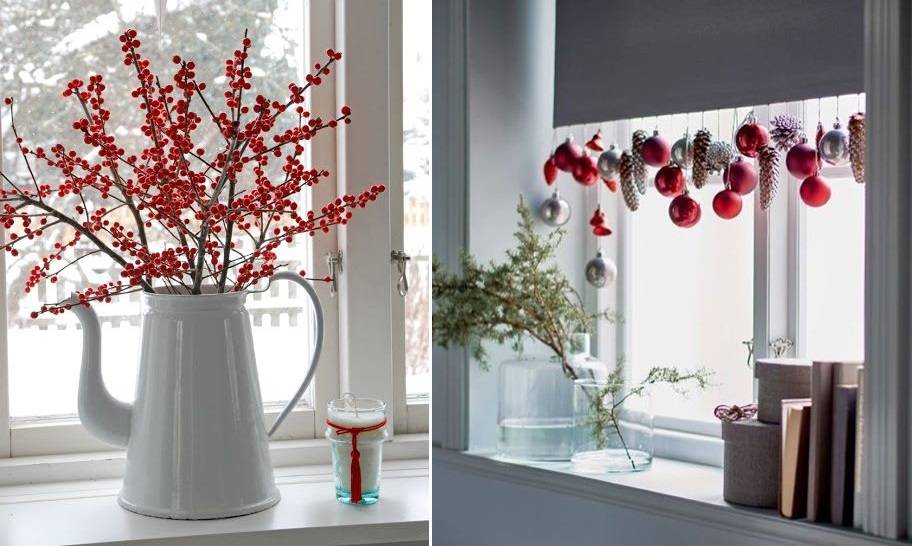 Подчеркнуть праздничность атмосферы помогут икебаны с использованием красиво оформленных веток хвои. Пришедшее из Японии искусство дает возможность выполнить красивые украшения с использованием простых вещей: красивых бутылок, необычных по форме плошек из глины или подносов. Часто такой декор предполагает использование серебряной или бронзовой краски, когда визуальный акцент привлекается к блестящей рождественской звезде или колокольчику. Гармонично дополняют интерьер новогодние композиции с использованием красных или белых цветов, мандаринов, яблок, лент, бус, свечей и небольших елочных шаров. Оригинально будет смотреться на подоконнике небольшая елка или снеговик.