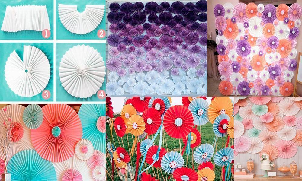 | Цветы и помпоны из бумаги | Гофрированная или папиросная бумага, ножницы, нитки | 1 помпон – 5 мин 1 цветок – от 10 мин | Стены, потолок, шторы |