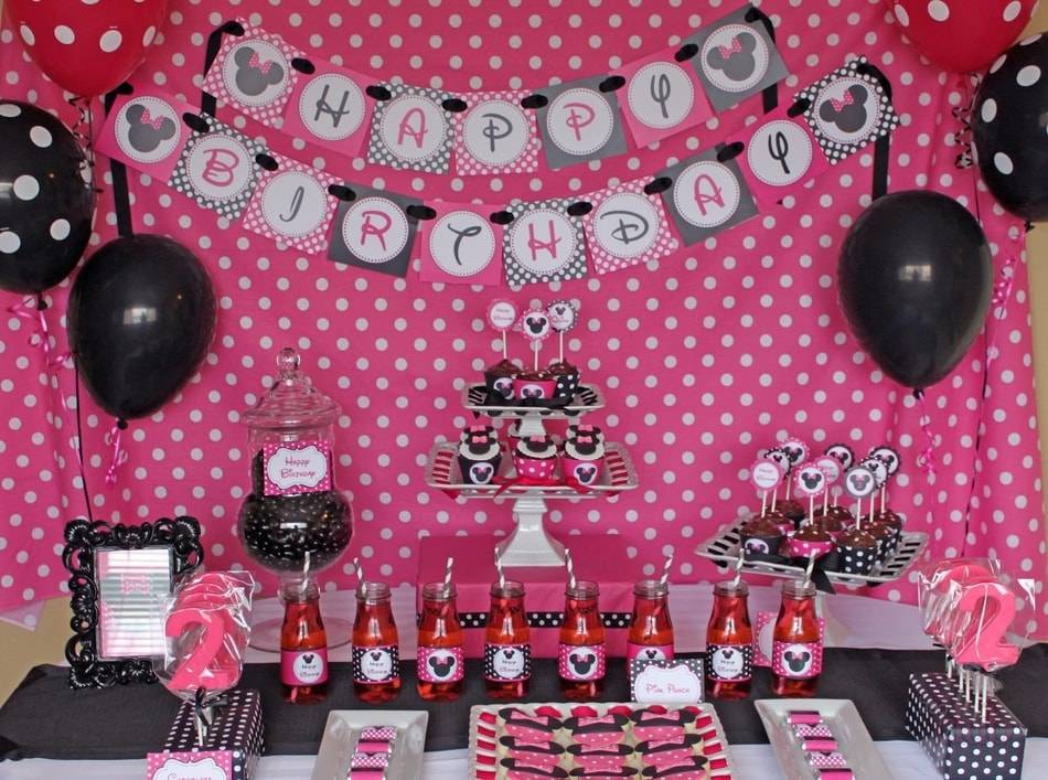 Основа декора в стиле Микки – горох и бантики. В качестве фона для фото можно использовать скатерть или просто ткань с принтом гороха. Гирлянда, шарики и помпоны также должны быть в одной цветовой гамме.