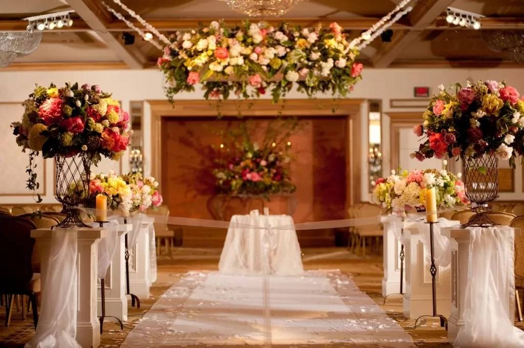 - Высокие потолки, к примеру, позволяют повесить ниспадающие цветочные гирлянды, которые превращают банкетный зал в райский уголок;