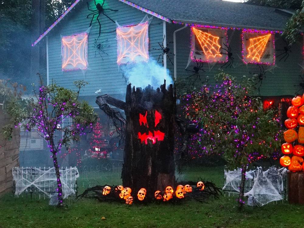 Деревья во дворе лучше украсить паутиной из марли, с мохнатыми пауками или чучелом птицы на верхней ветке. Красиво выглядит пугало, которое несложно создать самому или купить. Не забывайте про «кровь» – ее должно быть много. Черепа на земле или перед дверью добавят страха, а если разбросать мелкие кости под ногами, кто – то обязательно на них наступит и испугается. На арку или дерево нужно добавить скелет, а на своем авто маркером (который смоется) нарисовать трещины. Внутрь салона уместно посадить окровавленный муляж.