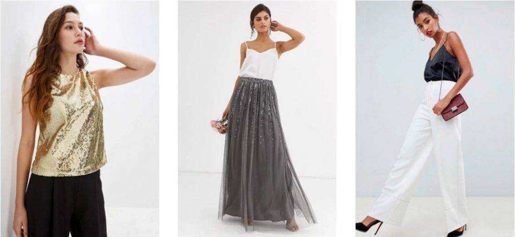 4. Топы. Струящиеся атласные на тонких бретельках или с люрексом – они и символу года, Металлическому Быку, понравятся, и создадут стильный образ. Топ, декорированный пайетками может послужить главным украшением в образе, т.к. сам по себе самодостаточен. Сочетаем с брюками – укороченными зауженными или, наоборот, максимально свободными – или той же летящей юбкой.