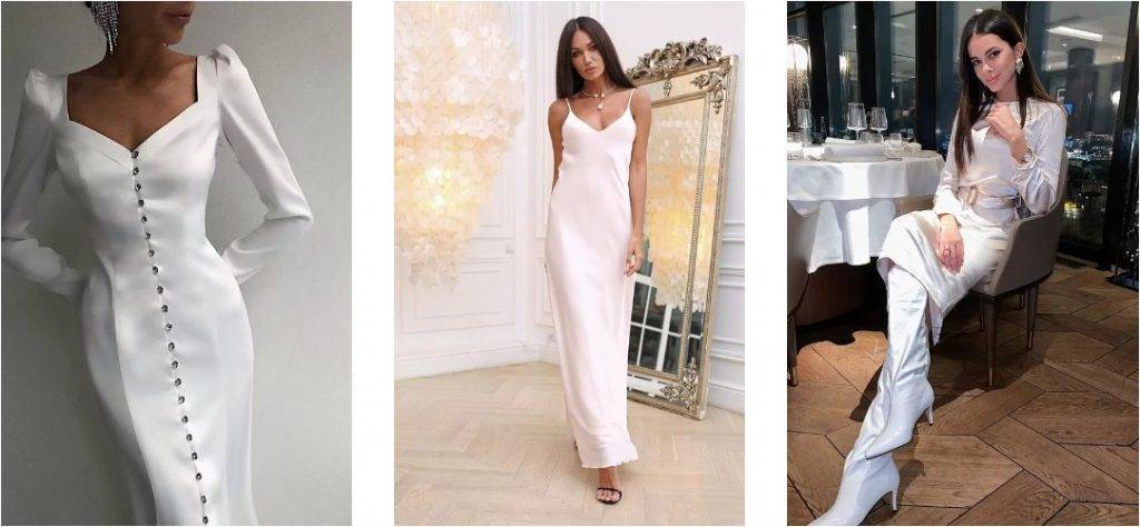 Сиять – девиз новогодней ночи. Сегодня актуально натуральное перламутровое сияние, которое схоже с переливами жемчуга. Выбираем атлас, шелк и сатин в светлых тонах. Хотите более утонченный образ – подойдет атласный брючный костюм с широкими брюками в пол. Если же хочется романтики, то отличным вариантом станет шелковое платье-комбинация на тонких бретелях.