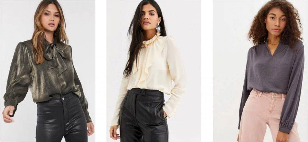 5. Блузки и рубашки. Свободного силуэта, не сковывающие движения, лучше однотонные. Шелковые и атласные блузы станут отличным нарядным вариантом и дополнят практически любой низ – будь то широкие брюки, кюлоты или юбка-карандаш. Вполне допустим и не вычурный декоративный элемент в виде банта или воротника с оборками или кружевом в винтажном стиле.