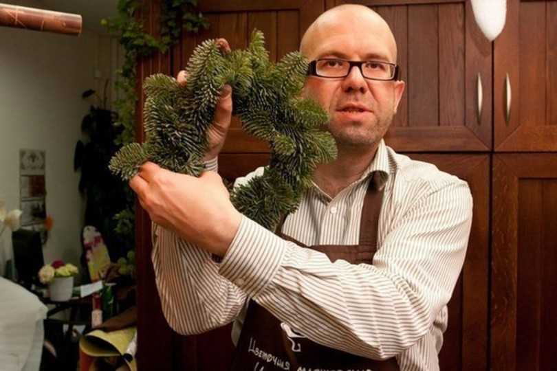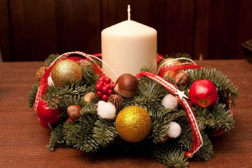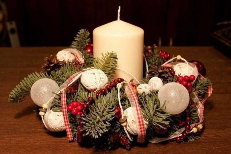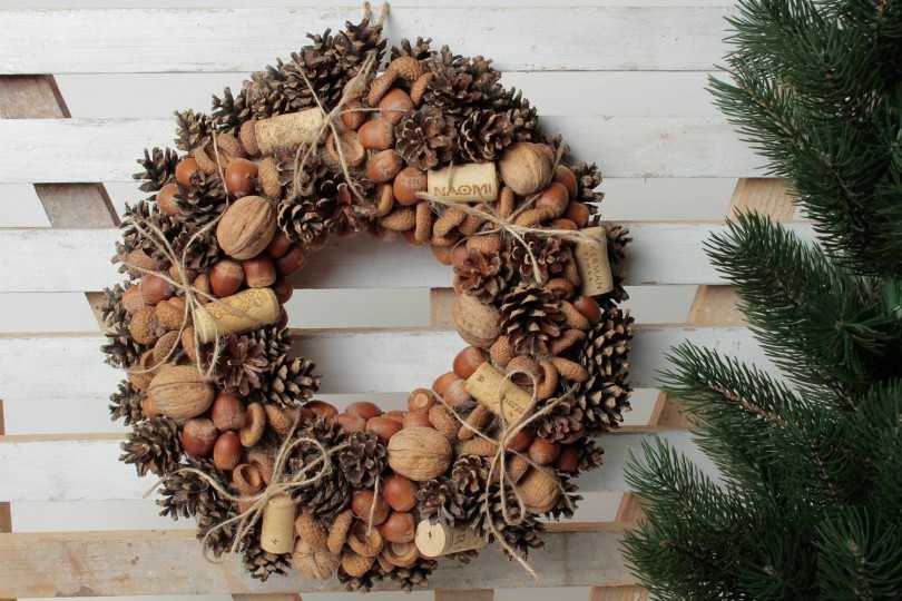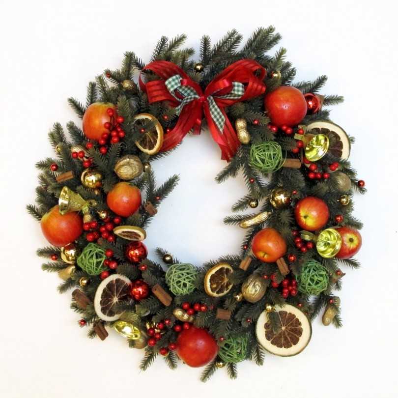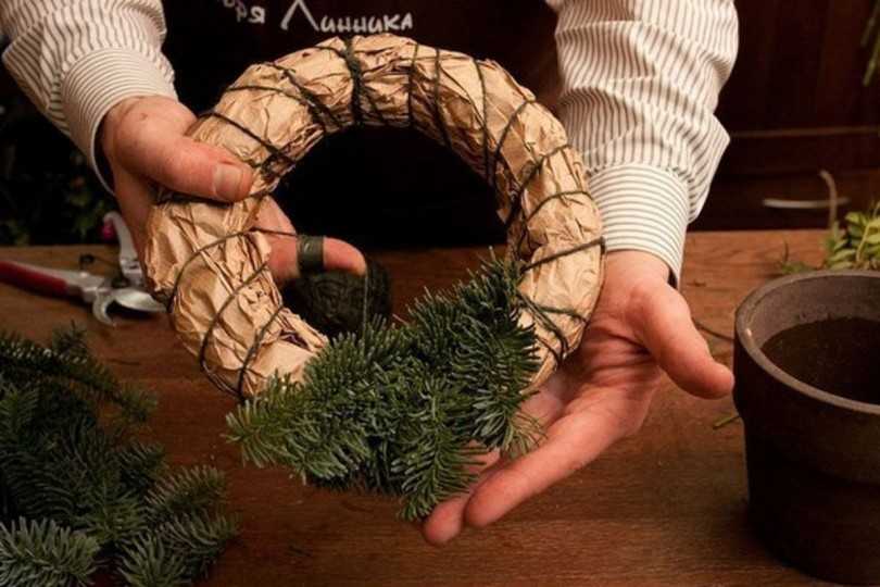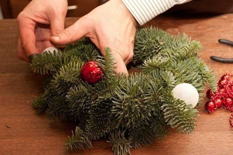Материалы для работы: толстая и тонкая проволока, клей «Момент», ветки хвои, игрушки. Первоначально делается круг в несколько слоёв, выбранного заранее диаметра. Пучки веточек крепятся к основе тонкой проволокой. Чем плотнее – тем пышнее. Для украшения приклеиваются сверху новогодние игрушки, бантики, дольки засушенного апельсина и так далее.