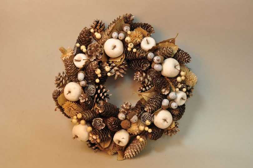 Приклеиваются по спирали к проволоке в форме еловой лапки. Остаточная часть обматывается флористической зелёной лентой. По методу плетения классического венка – придаётся округлая форма. Украшается блёстками, ягодами, снежинками.