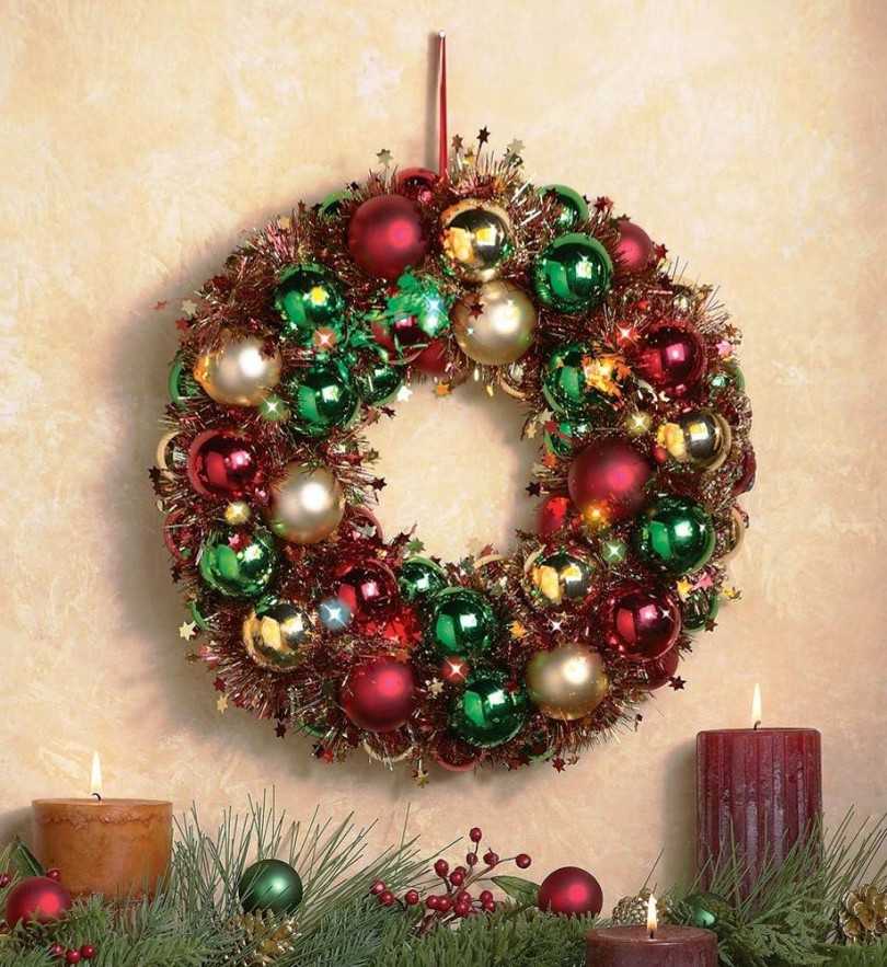 Самый простой и быстрый вариант – взять металлическую вешалку. Плечики согнуть в форму круга. Нанизывать на неё ёлочные шары и закрепить обратно, чтобы не рассыпались. Он смотрится эффектно и дорого.