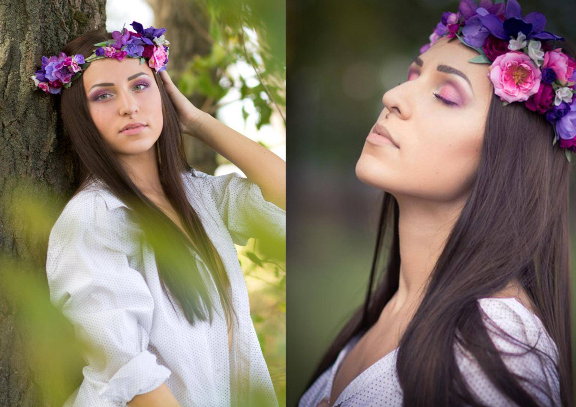 Яркий венок из больших цветов не стоит дополнять броским макияжем. Получится перегрузка образа.