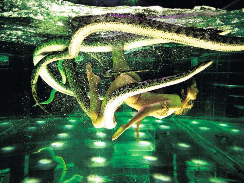 В кабаре применяются нестандартные решения, такие как цирк или подводные представления. В аквариуме, который заменяет сцену, гибкая, грациозная девушка тесно сплетает свое тело со змеями. Действо освещается яркой неоновой подсветкой, выглядит исключительно зрелищно.