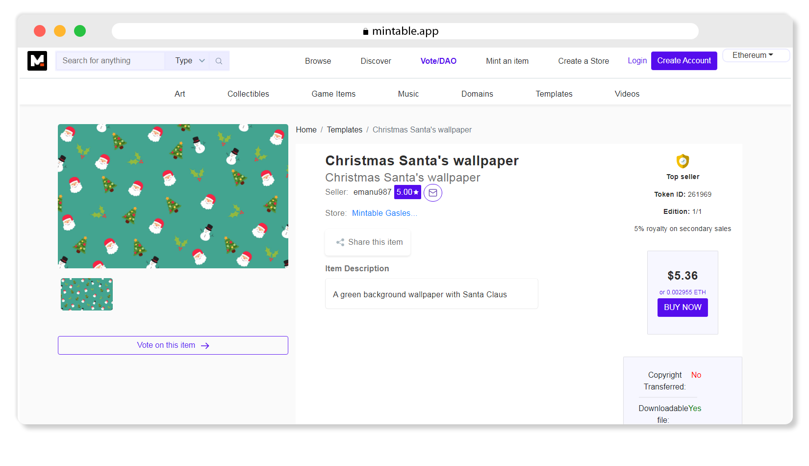 О платформе. В то время как на других платформах создаются коллекции с NFT, на Mintable можно создать свой магазин, где будут представлены арт токены. Магазин — это смарт-контракт для создания NFT. На Mintable можно продавать как диджитал картины, так и доменные имена, предметы коллекционирования, биты, видео и шаблоны. В категории «Видео» можно найти как музыкальные клипы, так и видео с домашними питомцами.