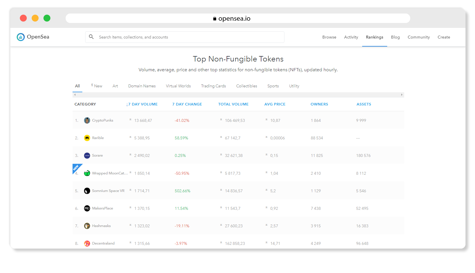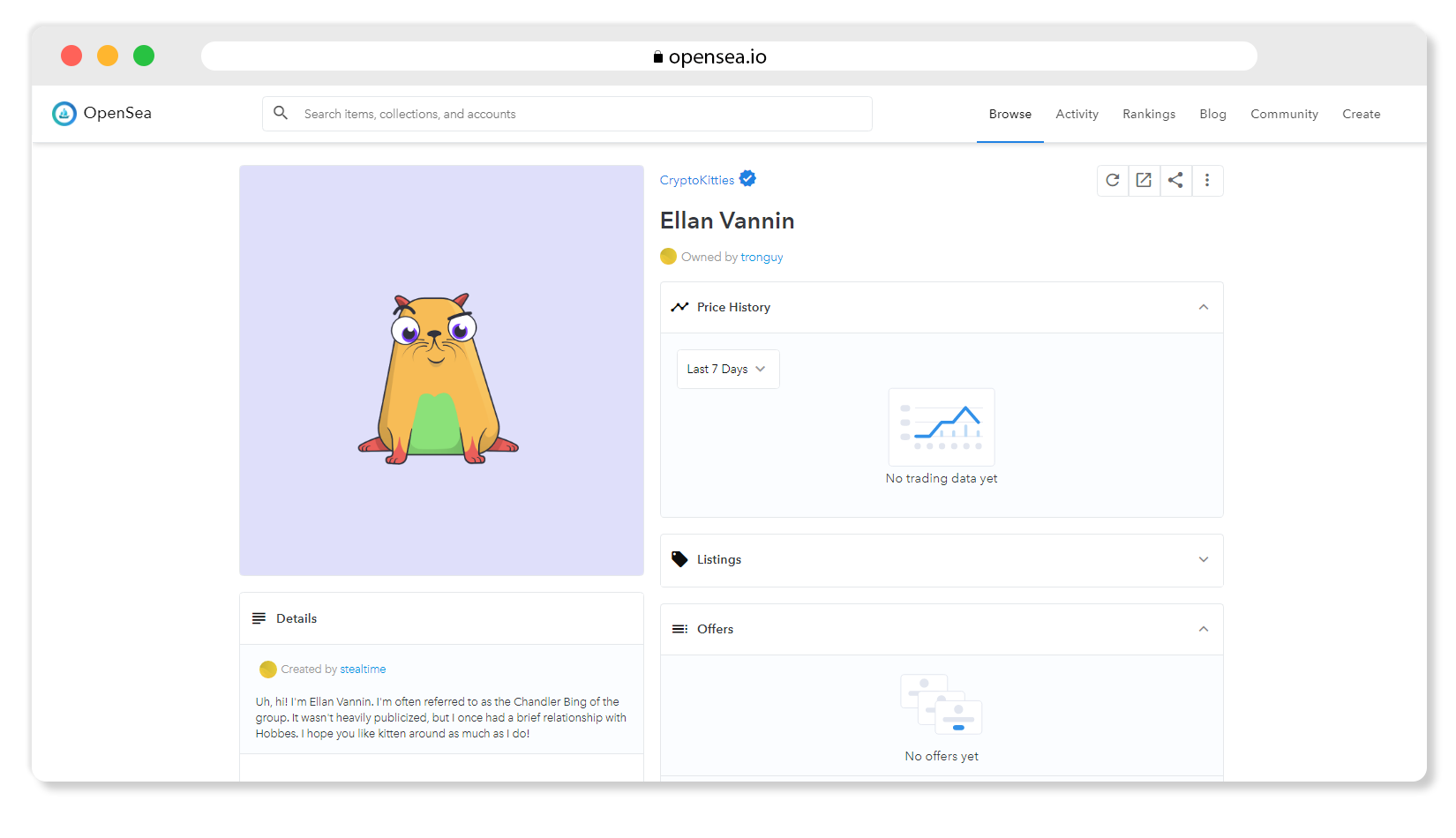 О платформе. На OpenSea можно купить и продать любые виды токенов. Не только из области искусства, но и доменные имена, виртуальные земли, игровые и спортивные карточки, коллекционные вещи и утилиты. Например, в категории «Утилиты» можно приобрести членство в сообществе «Bankless», оказывая ему спонсорскую поддержку. Или среди коллекционных вещей можно найти популярных КриптоКотиков.