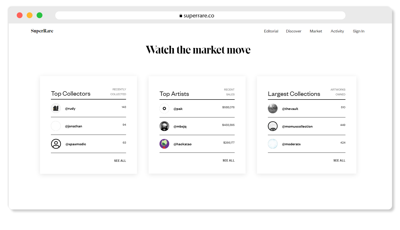 Чтобы на SuperRare купить работу или добавить свою необходимо зарегистрироваться на сайте и привязать криптокошелек MetaMask или Fortmatic. Перед тем как выложить работу на SuperRare, нужно пройти собеседование с администрацией площадки. Поэтому здесь размещаются известные в диджитал искусстве художники и работы оцениваются дороже, чем на Rarible и OpenSea.