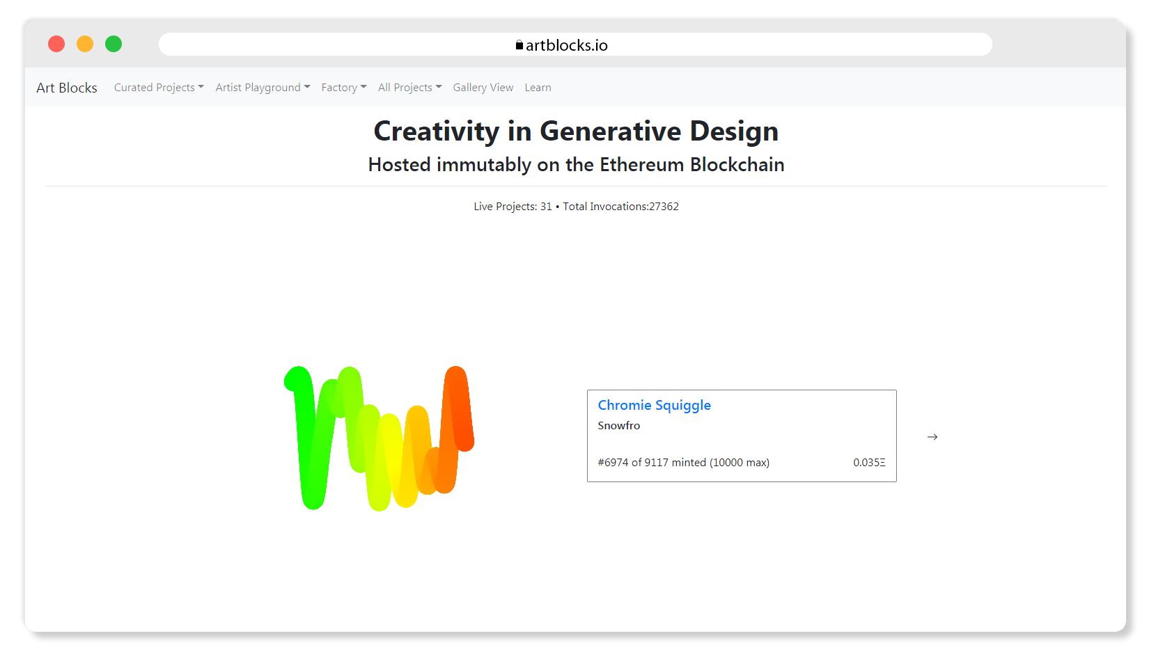 О платформе. ArtBlocks при покупке NFT генерирует случайный токен и пользователь до конца сделки не знает какую картину покупает. Он выбирает стиль, в котором выполнена работа, и оплачивает ее. Алгоритм случайным образом генерирует NFT по заданным параметрам и отправляется в учетную запись пользователя. В результате получится статическое изображение, 3D-модель или гифка.