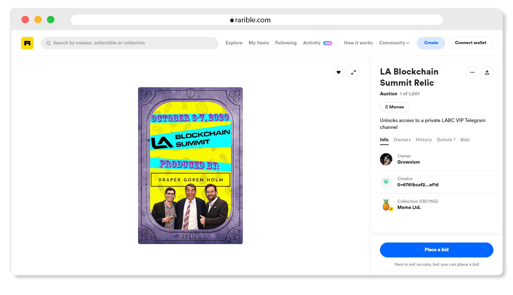 На Rarible можно продавать на как диджитал арт, так и игровые карточки, доменные имена, виртуальные земели и даже мемы. Например, в коллекции «Мемы» можно купить доступ к закрытому телеграм каналу Блокчейн Саммита в Лос-Анджелесе.