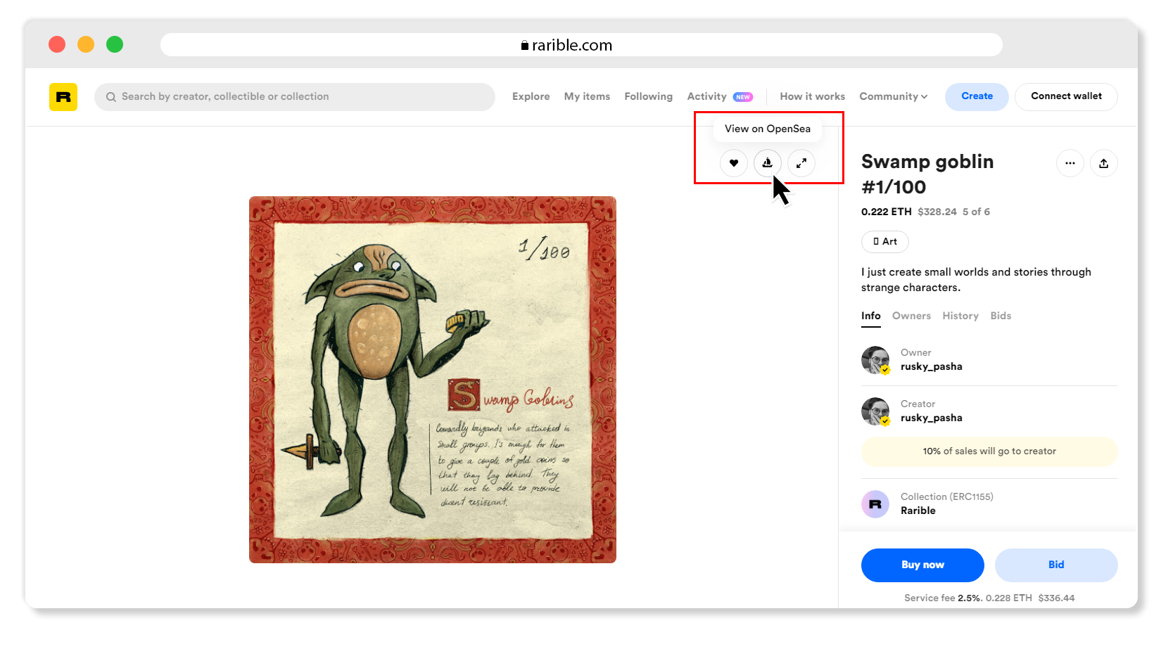 Партнерские программы. Rarible сотрудничает с площадкой OpenSea. То есть можно разместить работу на одной площадке, а она будет показываться сразу на двух. При этом ссылка на токен будет одна.