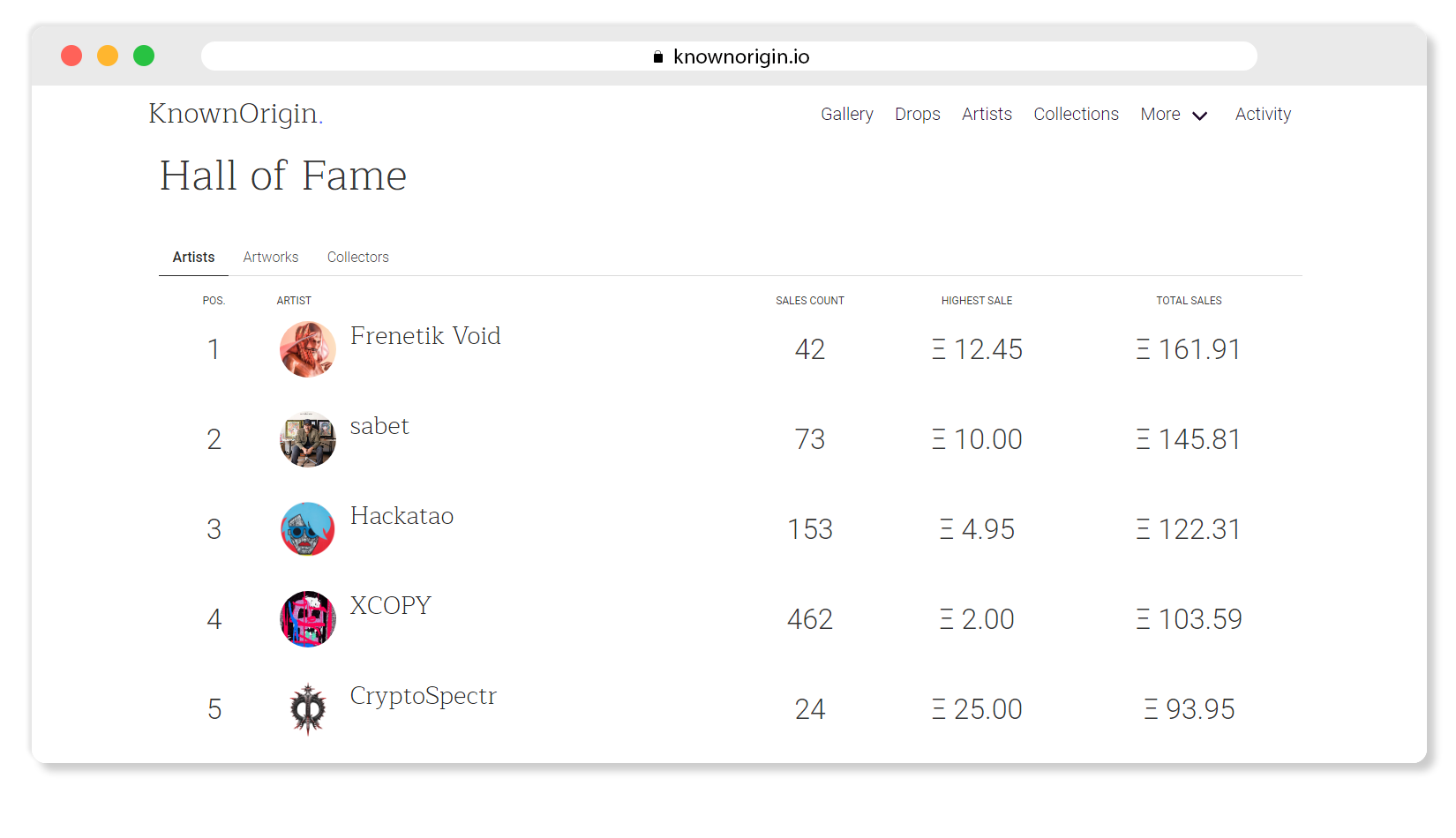 Чтобы разместить свои работы, нужно предварительно подать заявку на одобрение аккаунта художника. На Known Origin есть свой зал славы, где собраны самые высокооплачиваемые авторы, картины и коллекции.