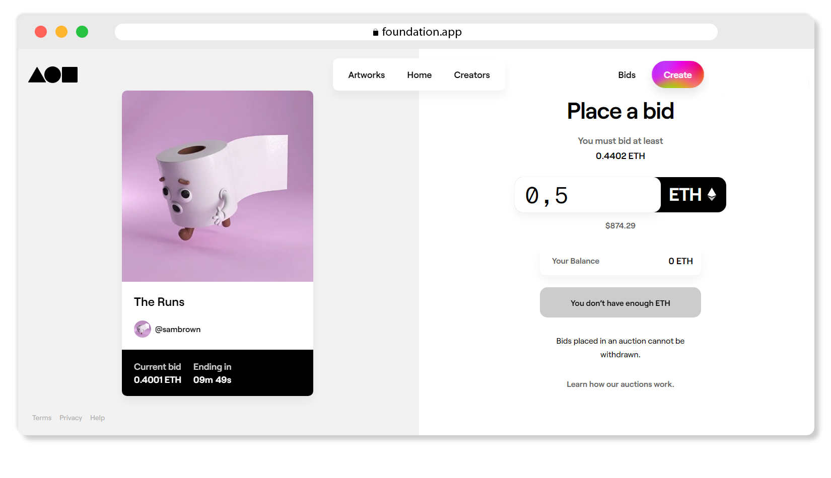 О платформе. На Foundation размещаются только диджитал картины. Чтобы приобрести арт токен, не нужно регистрироваться на платформе. Достаточно будет зайти через MetaMask.